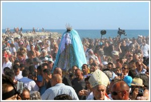 Every year on May 24th, a ceremony is held to Saint Sara in Saintes Maries de la Mer, which is located in Southern France. Her statue is carried down to the sea to re-enact her arrival in France. This ritual is similar to venerations in India, where statues are carried to bodies of water that are said to be sacred within ancient Hindu texts and washed within holy waters of the Ganges.